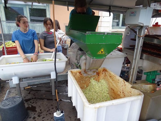 L’après-midi, opération pressage et obtention du jus, devant les ateliers du lycée.