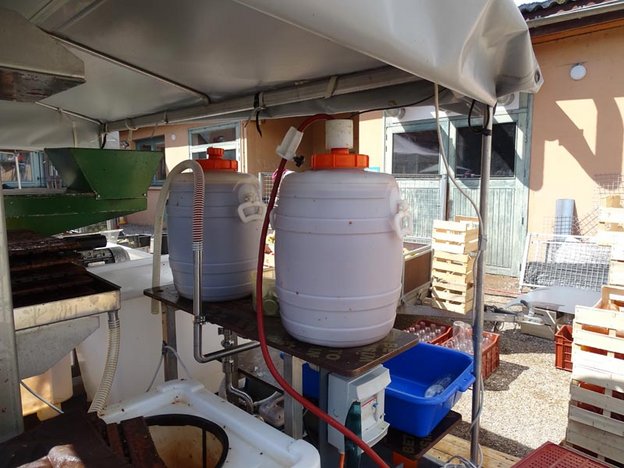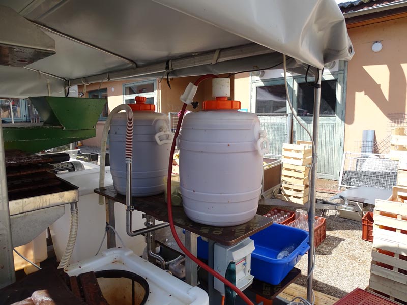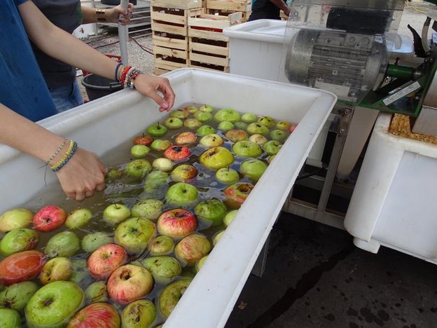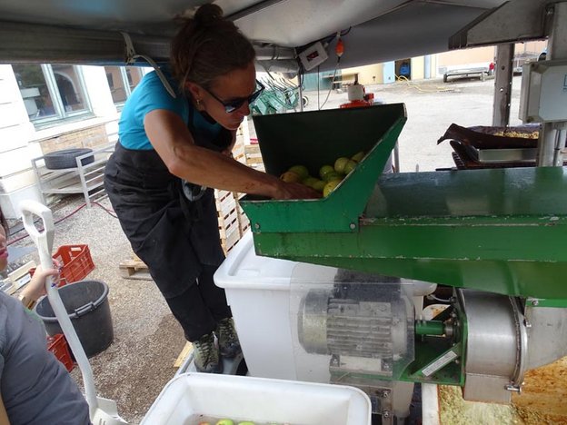 Tout d’abord le tri des pommes, avec retrait des parties abîmées si nécessaire. Aujourd’hui l’objectif est de préparer du jus de pommes et de poire. Pauline a donc apporté des poires venues de son propre verger (Bio), elles sont aussi triées et nettoyées, mélangées à raison d’un tiers de poires, deux tiers de pommes. Le lavage est alors opéré. Puis, il faut jeter les pommes dans le broyeur. Le broyat obtenu est pressé et filtré (presse hydraulique, dans sept carrés de toile). Le résidu, très sec, est retiré. Le jus est pompé dans des cuves en plastique alimentaire résistant à la chaleur, et chauffé pour permettre la pasteurisation, donc la conservation (la température est vérifiée). La mise en bouteilles est opérée.