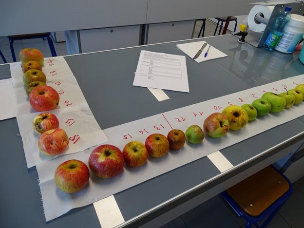 Le lundi suivant, observation d’échantillons de pommes pour approcher la question des différentes variétés de pomme observables dans le verger. Après un lavage minutieux, une analyse par les cinq sens a permis aux élèves de qualifier leurs impressions et de prendre conscience de la variabilité, notamment gustative. Chaque binôme devait remplir une fiche pour deux échantillons sur plusieurs critères, et indiquer aussi sa pomme préférée !