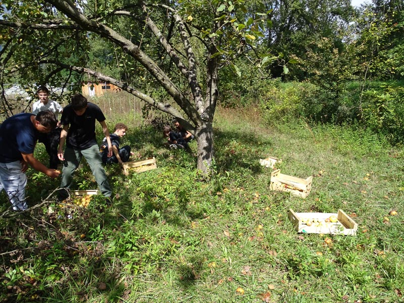 Sophie et Billie, de l’exploitation pédagogique de l’établissement, ont d’abord donné les consignes pour un ramassage efficace : les pommes trop abîmées au pied de l’arbre, les jaunes et vertes à peau lisse, juteuses et propices à la fabrication du jus de pommes (Type Granny, Belle de Boskoop), dans des cagettes et les roses à peau rugueuse, de type canada, trop charnues, dans d’autres cagettes.